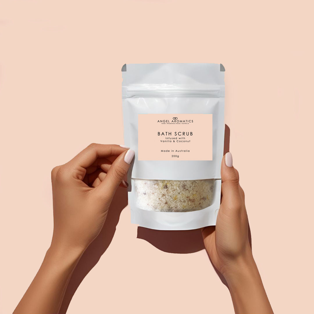 This set includes a matching body scrub and130g Soy Candle. Scented in Vanilla & Coconut
